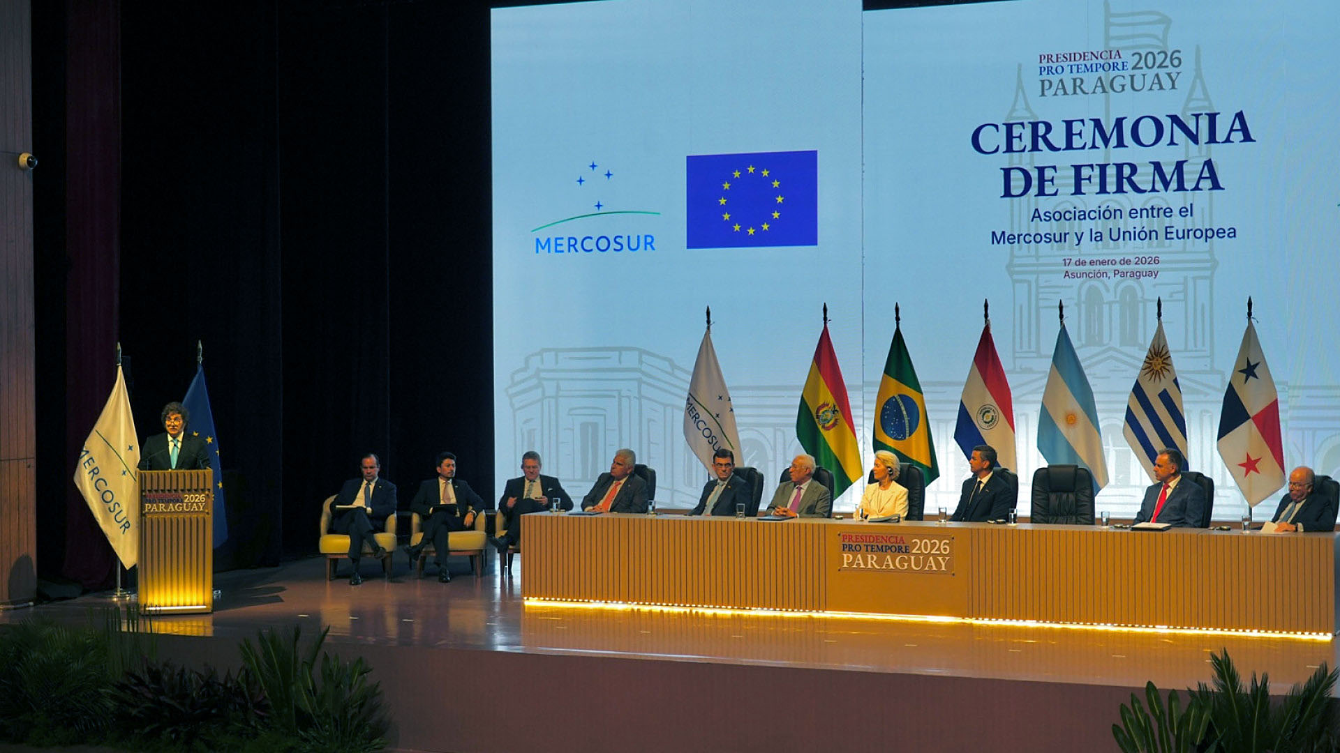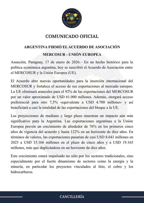 Cancillería informó que este 17 de enero se suscribió el Acuerdo de Asociación MERCOSUR-UE en Paraguay. El Ejecutivo sostuvo que la UE eliminará aranceles para el 92% de las exportaciones del bloque y otorgará acceso preferencial adicional para otro 7,5%. El tratado aún requiere ratificación en Europa y en los países del Mercosur.