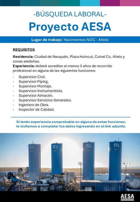 AESA lanzó una nueva búsqueda laboral para incorporar personal a un proyecto que se desarrollará en Añelo, Neuquén, con comienzo previsto entre junio y julio de este año. La convocatoria fue difundida por la propia compañía y está orientada a sumar perfiles con experiencia para tareas de supervisión, ingeniería, calidad y seguridad, en una de las zonas más activas de la industria hidrocarburífera argentina.