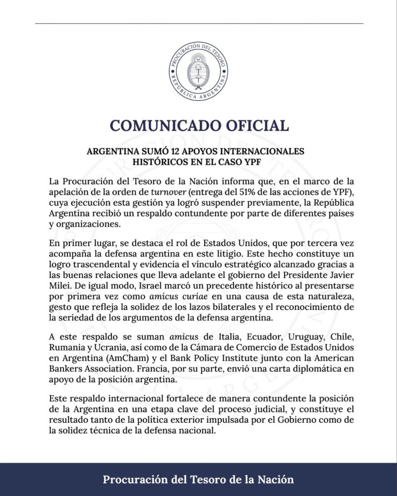 Señaló además que “se destaca el rol de Estados Unidos que por tercera vez acompaña la defensa argentina en este litigio. Este hecho constituye un logro trascendental y evidencia el vínculo estratégico alcanzado gracias a las buenas relaciones que lleva adelante el gobierno del presidente Javier Milei”.
