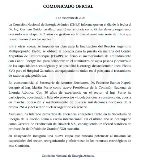 La Comisión Nacional de Energía Atómica (CNEA) informó que el Dr. Ing. Germán Guido Lavalle presentó su renuncia como titular del organismo, cerrando una etapa de dos años de gestión. En el mismo texto, el organismo enumeró una serie de avances del período, como el impulso a un plan para la finalización del Reactor Argentino Multipropósito RA-10, la obtención de la licencia para la puesta en marcha del Centro Argentino de Protonterapia (CEArP), la firma de un memorándum de entendimiento con Candu Energy Inc. y la entrega del acelerador lineal Elekta EVO para el Hospital Garrahan destinado a radioterapia pediátrica.