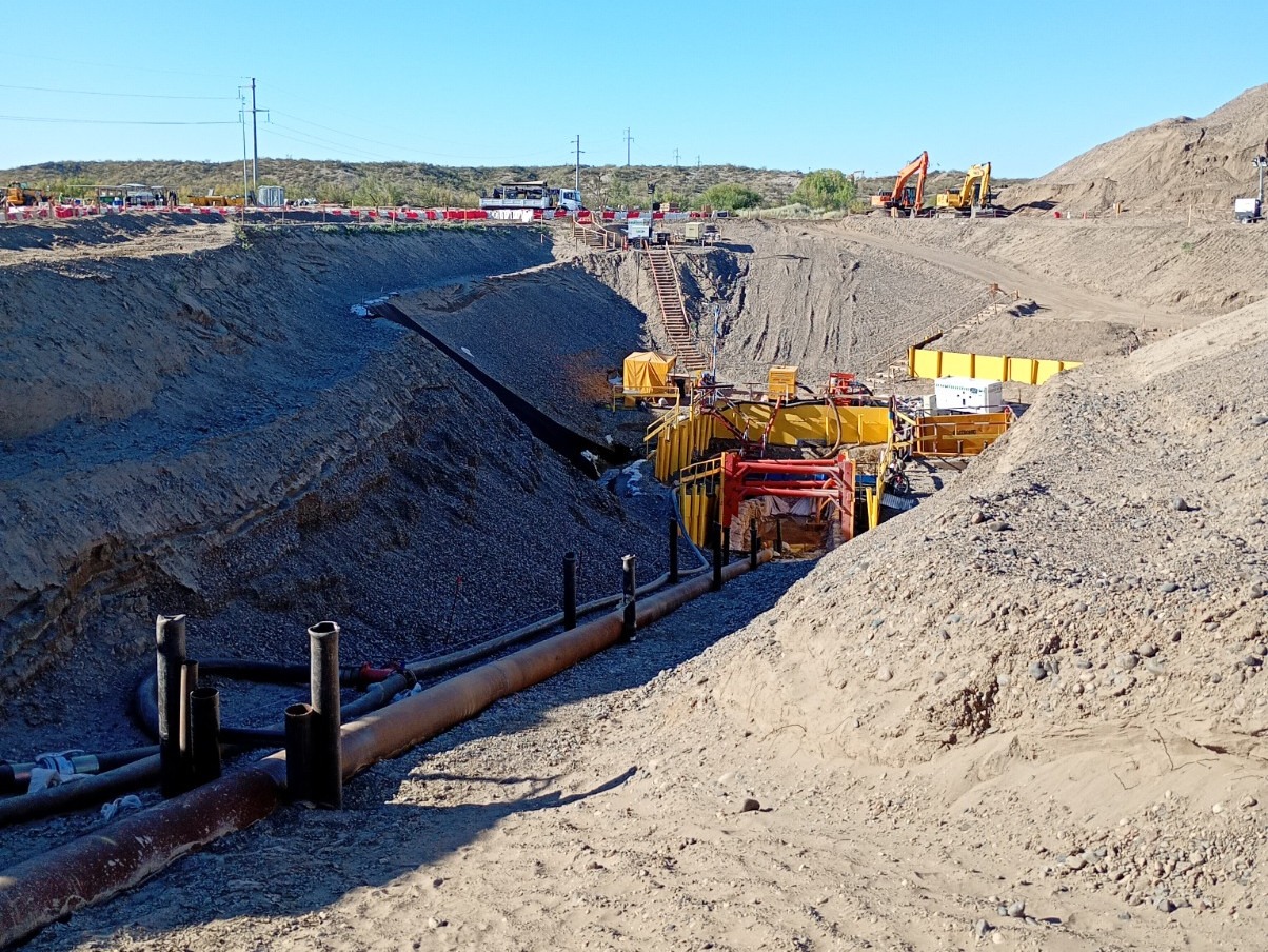 En esta primera etapa se inició y finalizó la perforación testigo. Las próximas tareas contemplan la ampliación progresiva del túnel hasta alcanzar el diámetro final de 44 pulgadas.