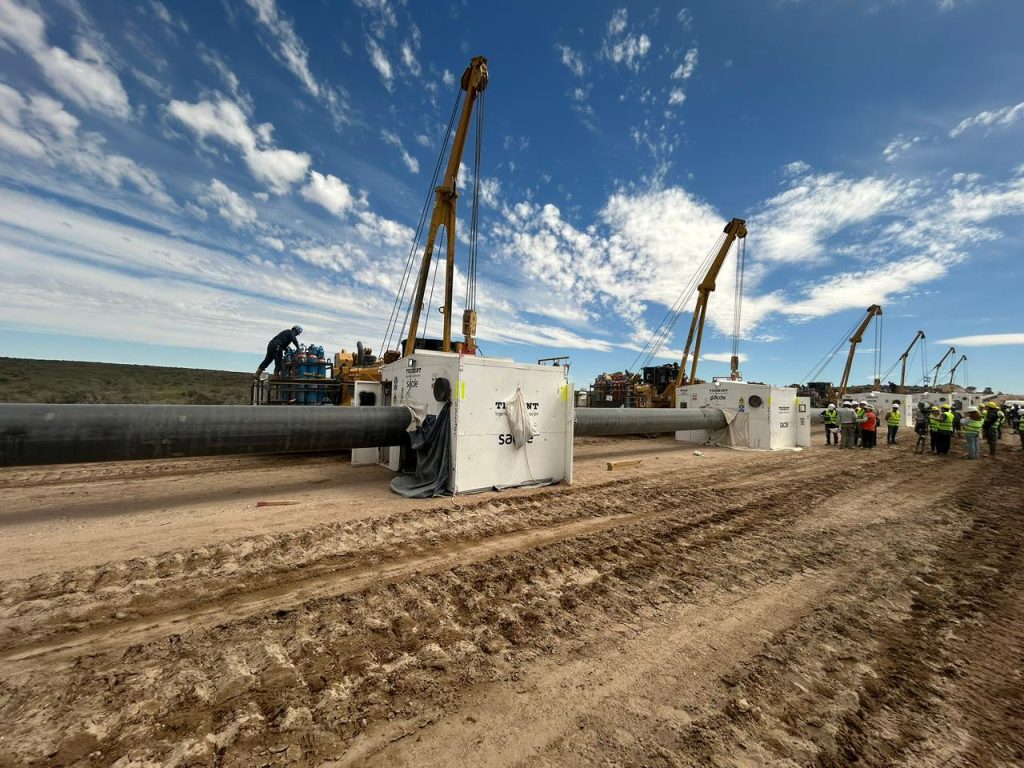 Cuatro kilómetros por día se suman al tendido, una cadencia que parece simple cuando se escribe, pero que nace del pulso sincronizado de más de 120 operarios que se relevan, se cuidan y se empujan unos a otros para que nada falle. Cada junta, ajustada y brillante, toma apenas cuatro minutos de soldadura: es solo el primero de siete pasos; detrás de ese destello hay horas de preparación, chequeos y miradas atentas. Después vendrá enterrar los caños a unos 2,5 metros y, en la costa, darles continuidad siete kilómetros mar adentro. Porque la obra no termina con la última chispa: ahí empieza otro tramo de paciencia y precisión.