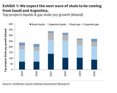En la imagen titulada “We expect the next wave of shale to be coming from Saudi and Argentina”, Goldman Sachs muestra cómo crecería la producción de shale entre 2026 y 2030, desagregada por país y por tipo de hidrocarburo. El gráfico presenta barras apiladas con el aporte de petróleo y líquidos de gas de Arabia Saudita y de Argentina, tanto en crudo como en gas, medidos en miles de barriles equivalentes de petróleo por día (kboe/d).