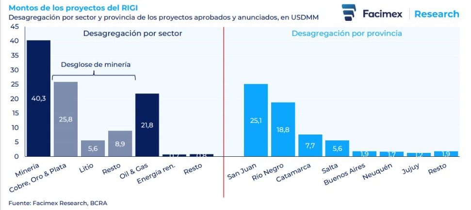 La composición sectorial de los proyectos incluidos en el RIGI muestra que la mayor parte de los montos anunciados corresponde a la minería, con u$s 40.300 millones. Dentro de ese universo, los proyectos de cobre, oro y plata concentran u$s 25.800 millones, mientras que el litio suma u$s 5.600 millones. En segundo lugar aparece el sector de oil & gas, con u$s 21.800 millones, lo que ratifica que la energía sigue siendo uno de los motores centrales de esta nueva ola de inversiones.