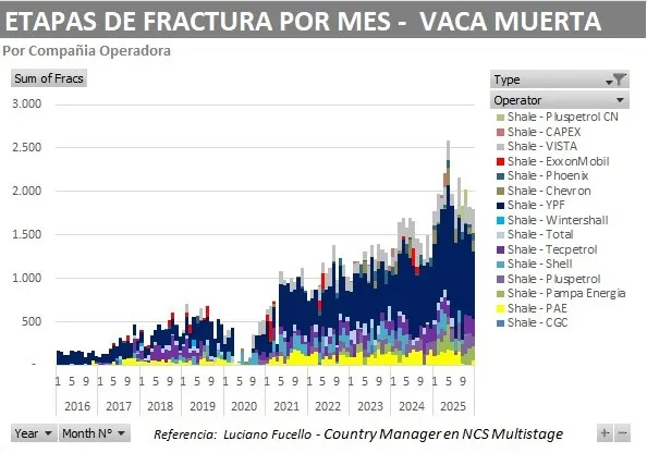 Si lo comparamos con los últimos años, la tendencia es consistente y cada año agrega un escalón. Desde la recuperación post 2020, los valores anuales fueron creciendo de manera firme: 2022 se ubicó en el orden de las 12.500 etapas; 2023 rondó las 14.700; 2024 trepó a cerca de 17.800; y 2025 directamente se estacionó en la zona de las 24.000. En otras palabras: el sistema no solo creció, sino que lo hizo con una pendiente cada vez más pronunciada, lo que obliga a pensar el negocio no solo en términos de pozos y producción, sino de infraestructura, disponibilidad de equipos, logística y competitividad de proveedores.