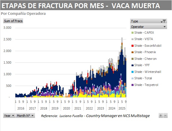 El gráfico también muestra cómo se distribuye la actividad entre las compañías. YPF, en azul oscuro, sigue siendo el actor dominante, concentrando el mayor número de etapas de fractura y sosteniendo su rol de motor de la industria. En amarillo se destaca Vista Energy, que desde 2019 viene escalando su participación de manera constante hasta posicionarse como el segundo jugador más importante en la formación. Tecpetrol, identificado en violeta, mantiene una presencia estable en la ventana de shale oil, consolidando su estrategia de producción en áreas clave. A esto se suma el aporte de compañías internacionales como ExxonMobil, Chevron, Wintershall y Total, además de la creciente actividad de Phoenix, que diversifican el mapa de operadoras y aportan competitividad al ecosistema de Vaca Muerta.